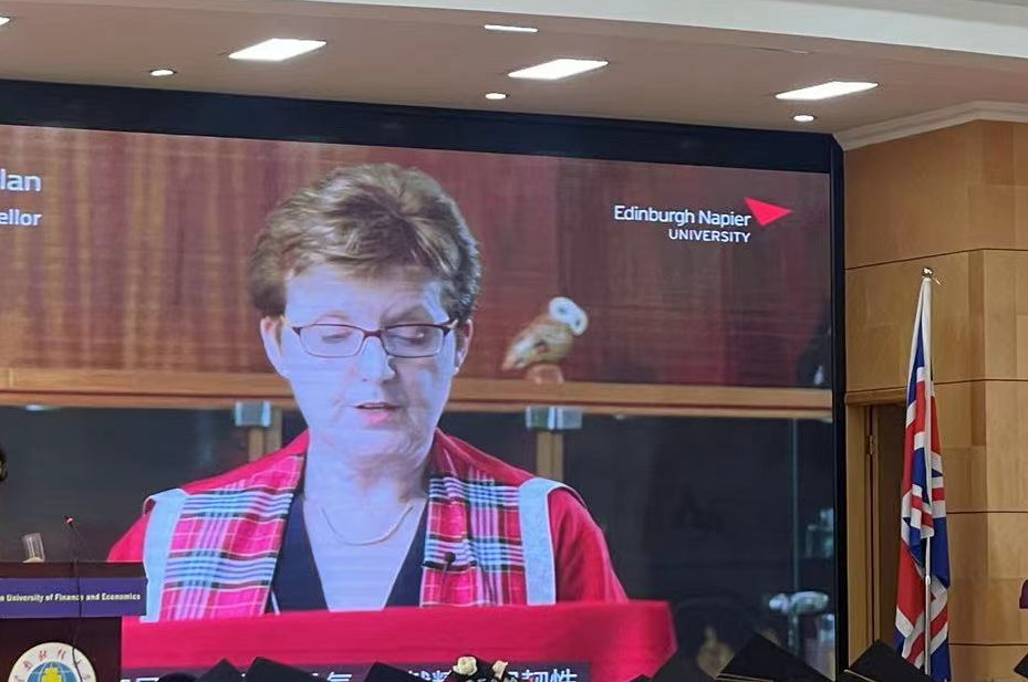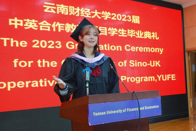 6月16日上午,云南财经大学与英国爱丁堡龙比亚大学合作举办的金融学专业本科教育项目第8届毕业生毕业典礼在国际工商学院国际报告厅隆重举行。爱丁堡龙比亚大学校长Nolan教授、国际发展部主任Tjandra博士、项目主管Henry Huang以线上视频的方式参加典礼,现场出席典礼的有国际工商学院院长王荣党、党委书记林浩。王院长与林书记为毕业生一一授予学位并为本届优秀毕业生张辛迪发了优秀学业奖章。