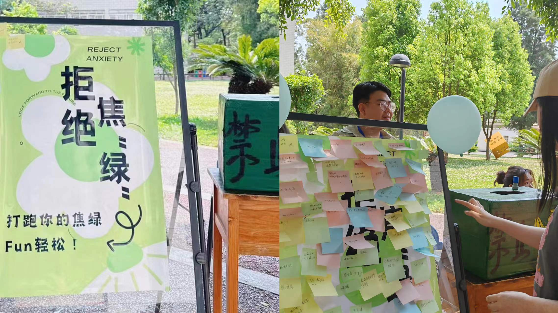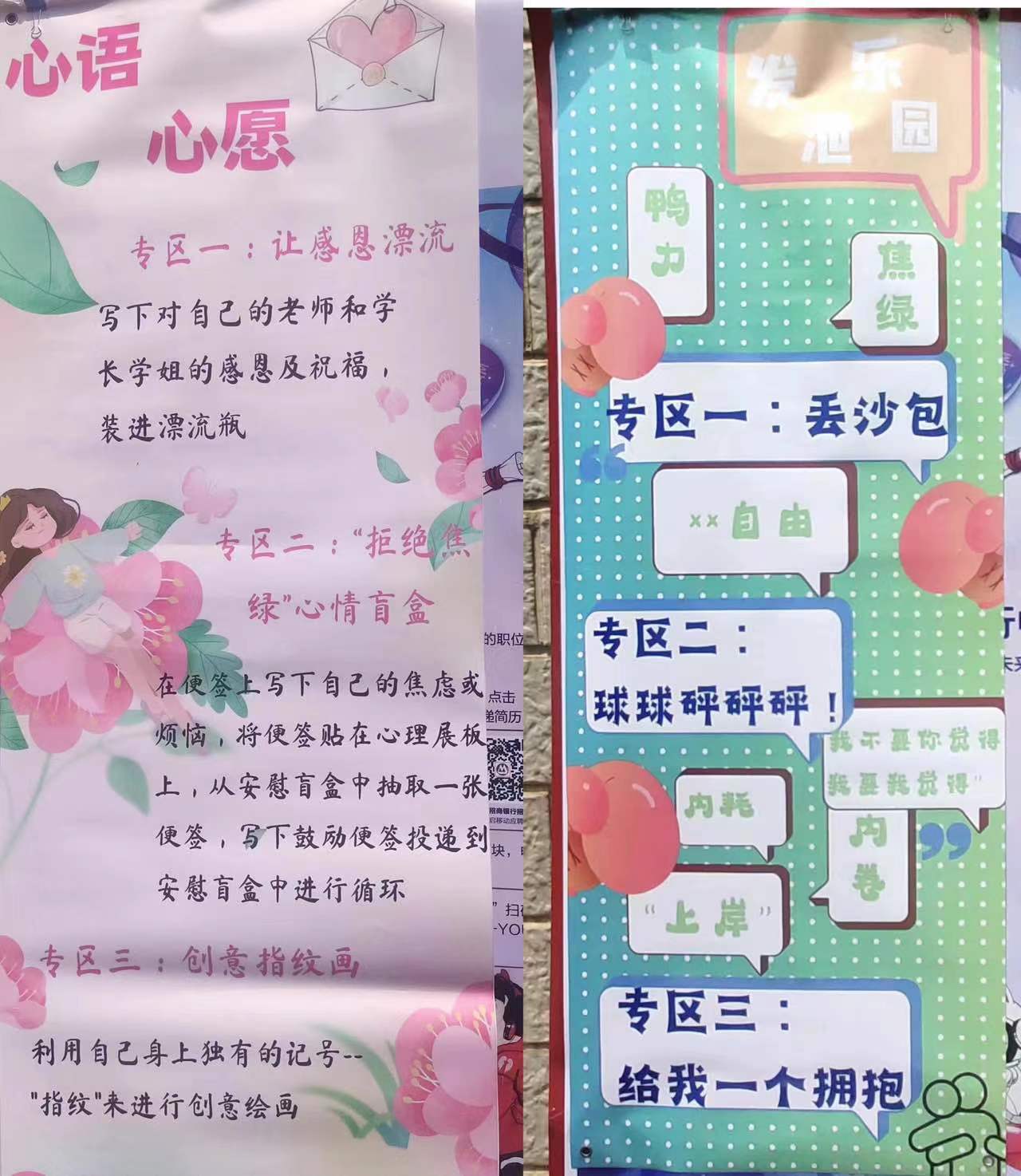此次活动分为“创意指纹画”“拒绝焦‘绿’心情盲盒”“让感恩漂流”“丢沙包”“球球砰砰砰”“给我一个拥抱”六个专区,共140余名同学参加。通过此次活动的参与,不仅调整了同学们的状态,更加深了同学们对自我的认知。