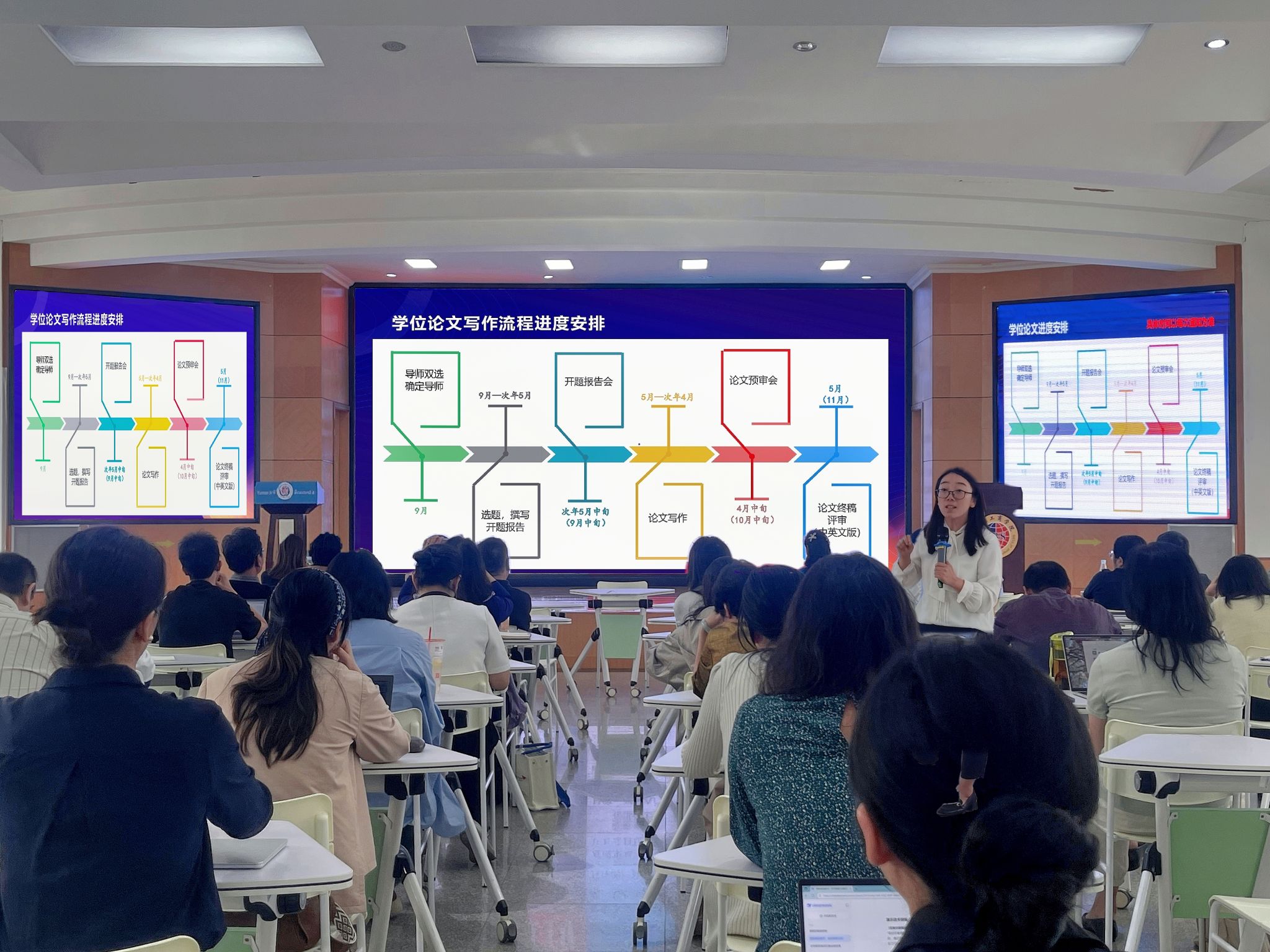 在培训环节,研究生教育与科研管理科负责人于东平老师围绕五大核心内容展开详细讲解。她首先聚焦导师队伍师德师风建设,强调师德是导师开展工作的根本准则,需将思政教育融入学术指导全过程;随后,针对论文进度安排,明确了不同阶段的时间节点与任务要求,帮助导师合理规划指导节奏;在论文开题评审、预审评审及终稿评审方面,于东平老师分别梳理了各环节的评审标准、流程规范及常见问题解决方案,通过具体案例分析,让导师们清晰掌握评审要点,为保障项目学位论文质量与人才培养水平筑牢了基础。