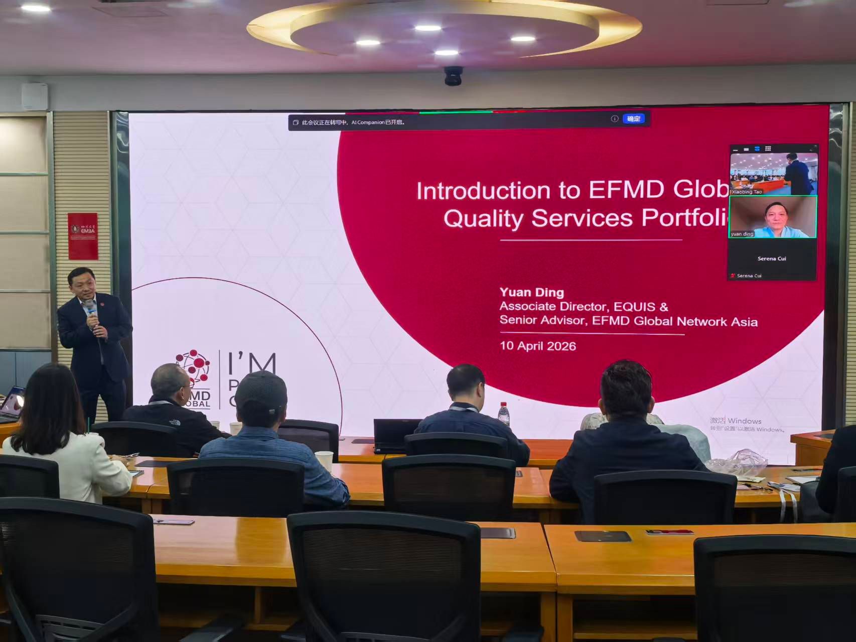 为把握新版EQUIS认证标准与认证流程的变化,推进学院EQUIS国际认证申报进程,4月10日,学院副院长尹豪带队参加由欧洲管理发展基金会(EFMD)主办,四川大学商学院承办的2026年EFMD与EQUIS认证研讨会。EFMD亚太地区负责人、商学院国际认证专家丁远教授通过视频会议形式做认证规则宣讲,并对现场的问题进行答疑。认证工作专班艾冰兵老师参加研讨。