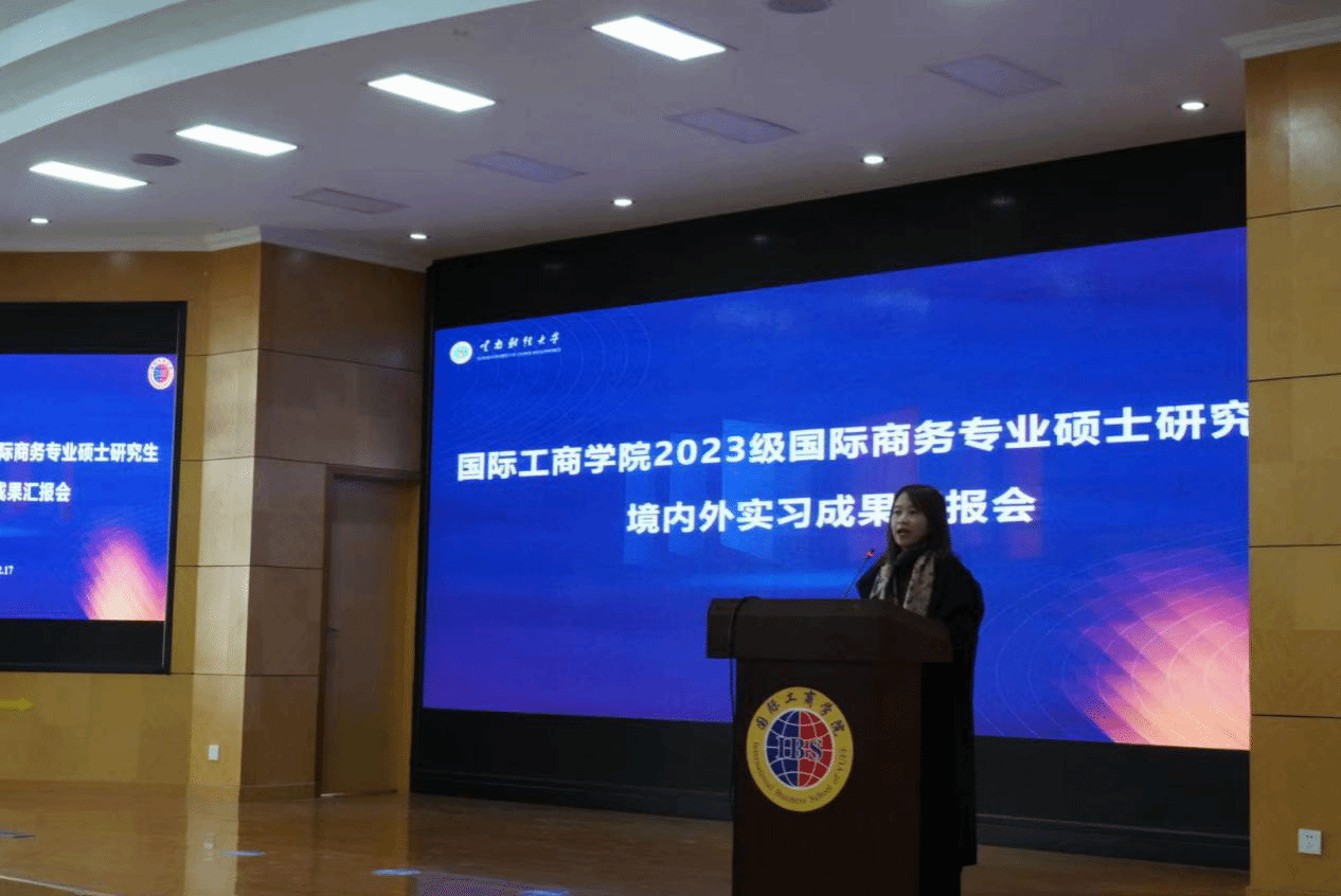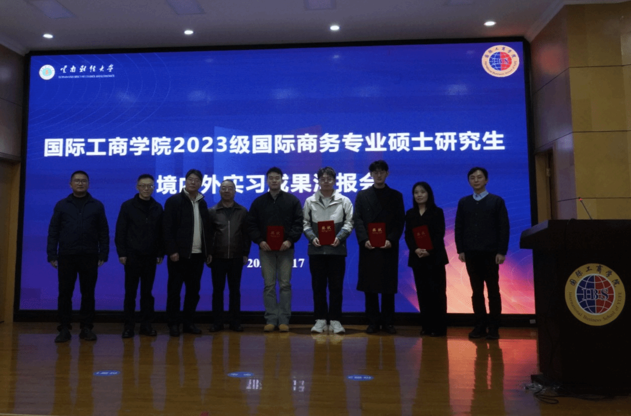 2025年12月17日下午,国际工商学院2023级国际商务专业硕士境内外实习成果汇报会在学院办公楼二楼国际报告厅顺利举行。本次汇报会旨在展示学生实习实践成果,深化“政-校-企”协同育人成效,为人才培养质量提升搭建交流平台。